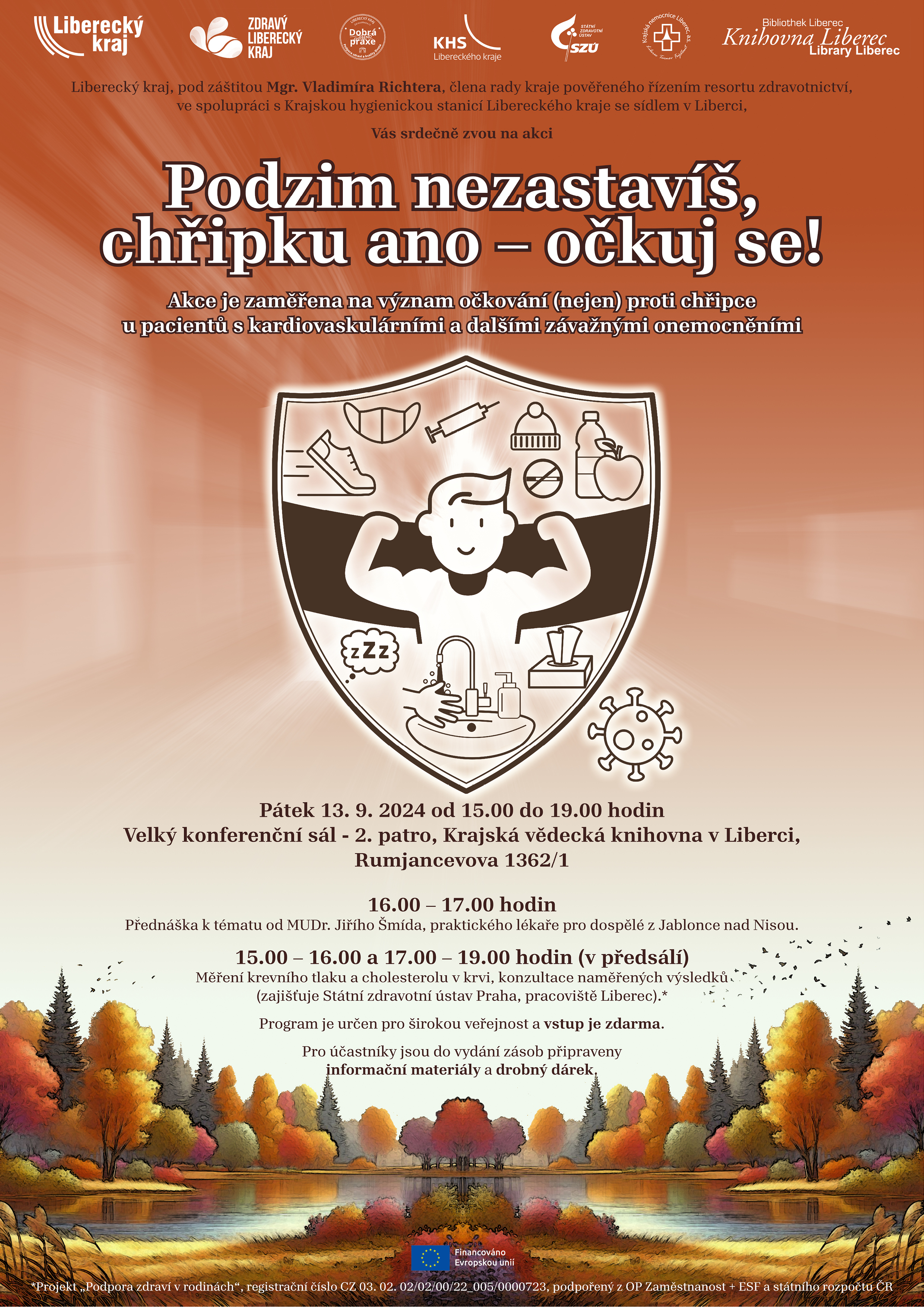 Se začátkem podzimu je potřeba připravit se na chřipkovou sezonu. Odbor zdravotnictví Krajského úřadu Libereckého kraje ve spolupráci s Krajskou hygienickou stanicí Libereckého kraje, libereckým pracovištěm Státního zdravotního ústavu Praha a lékaři připravil zdravotně preventivní akci s názvem Podzim nezastavíš, chřipku ano – očkuj se! Akce se bude konat v pátek 13. září 2024 v Krajské vědecké knihovně v Liberci.